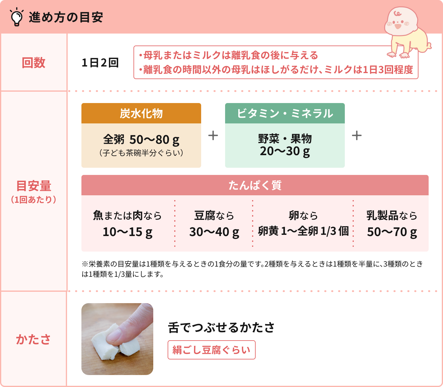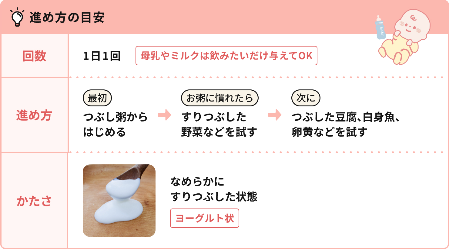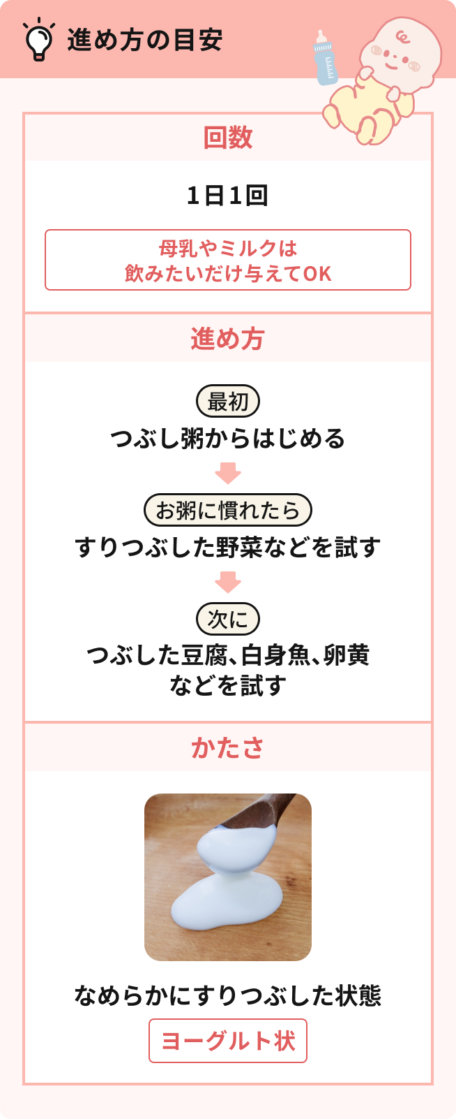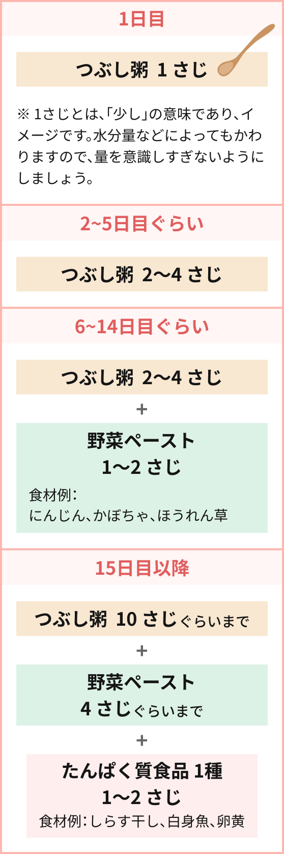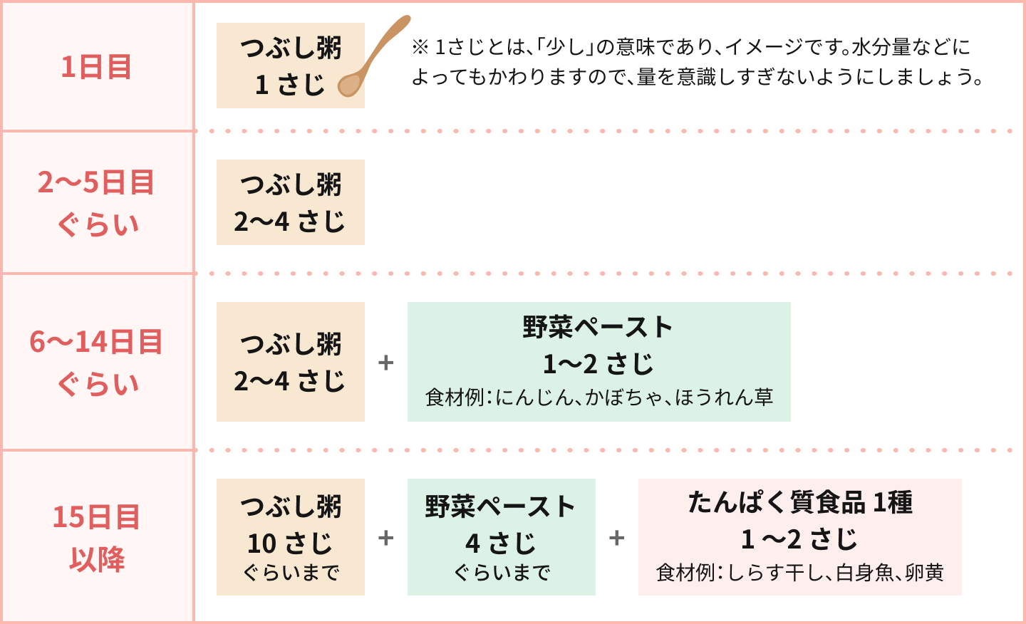 進め方はあくまで目安です。決まりではありません。量や日数は赤ちゃんの様子をみながら調整しましょう。うまく進まない日はお休みしてもOK。