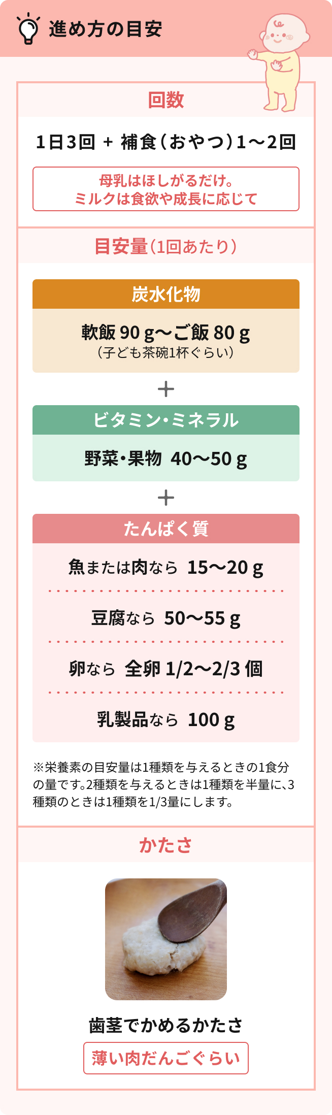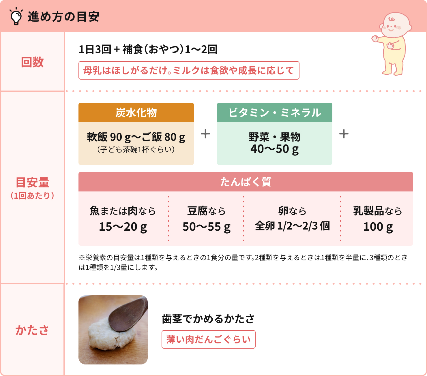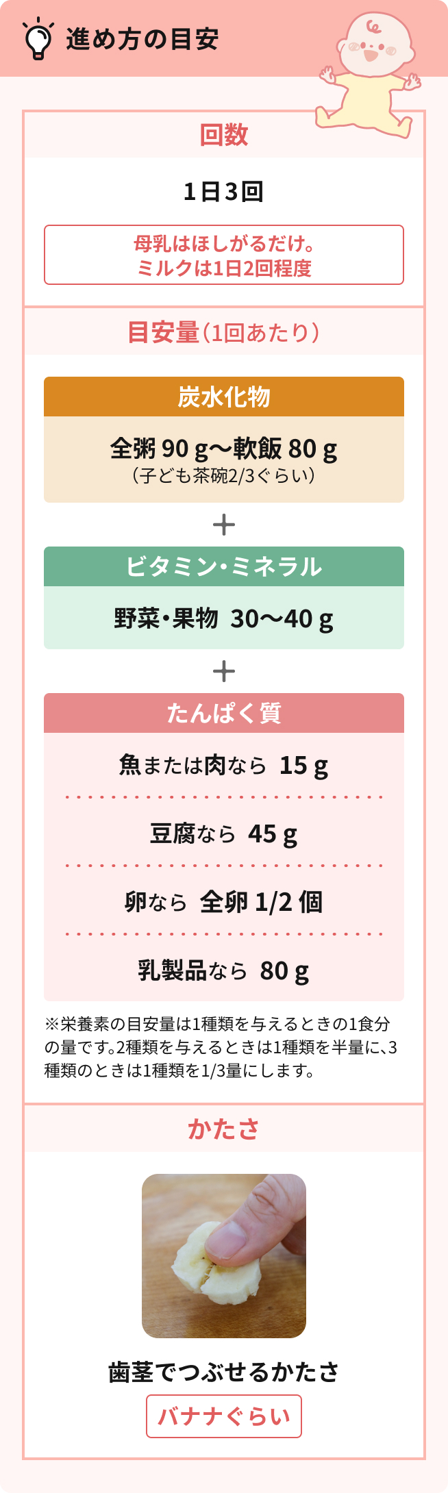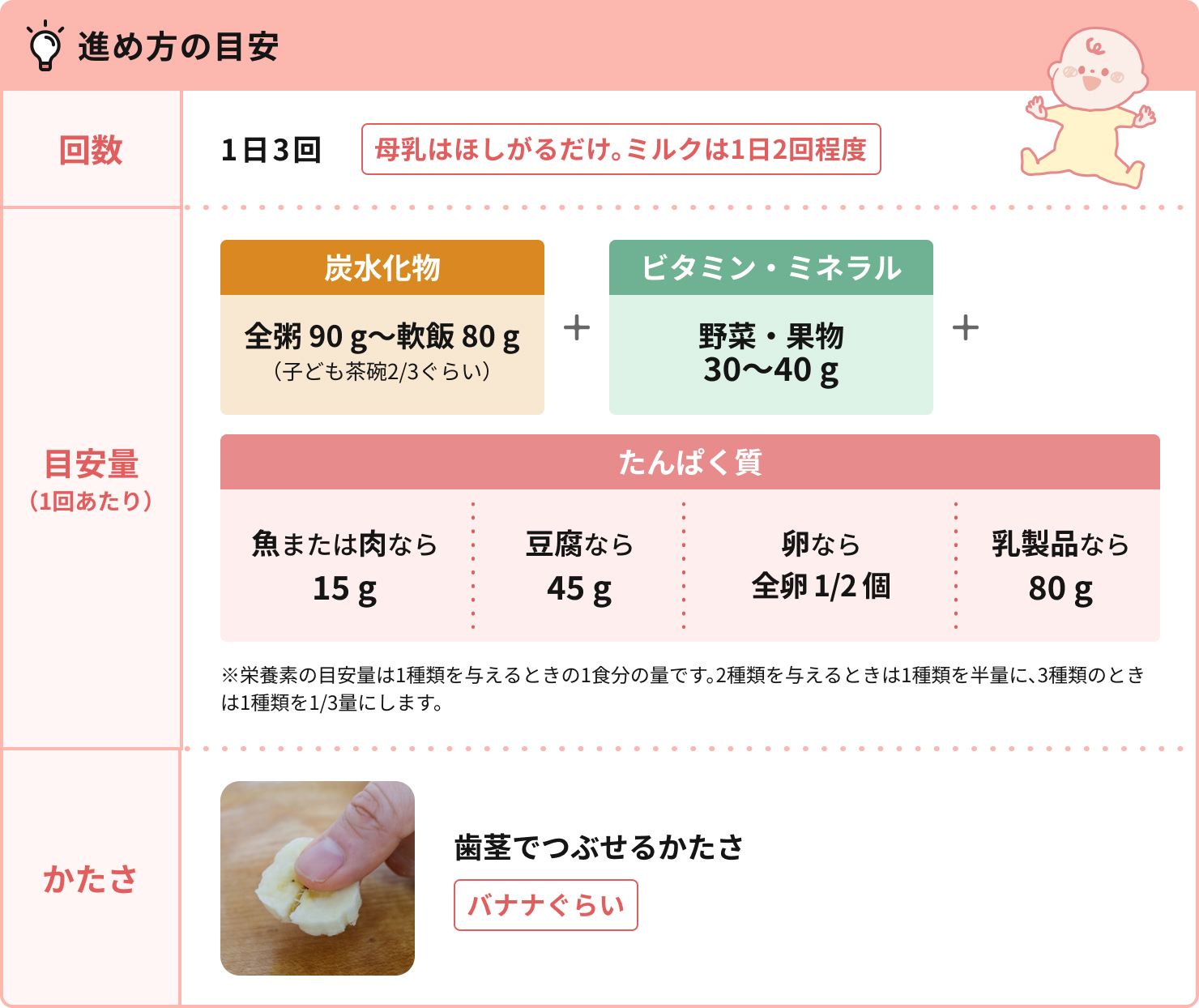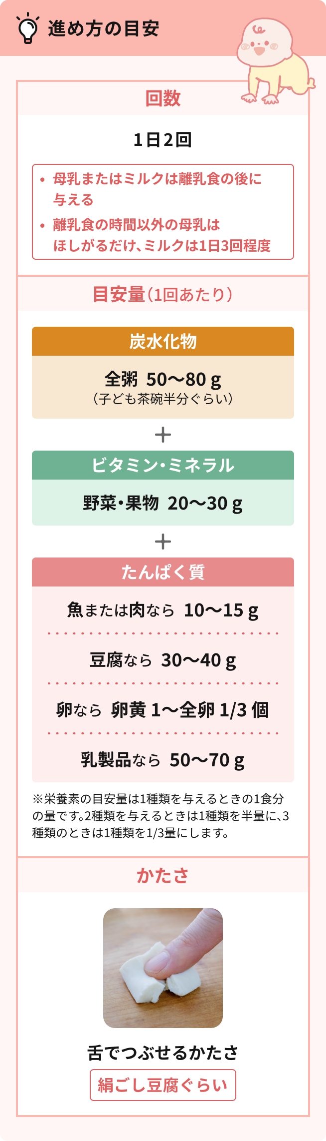 進め方はあくまで目安です。決まりではありません。量や日数は赤ちゃんの様子をみながら調整しましょう。うまく進まない日はお休みしてもOK。