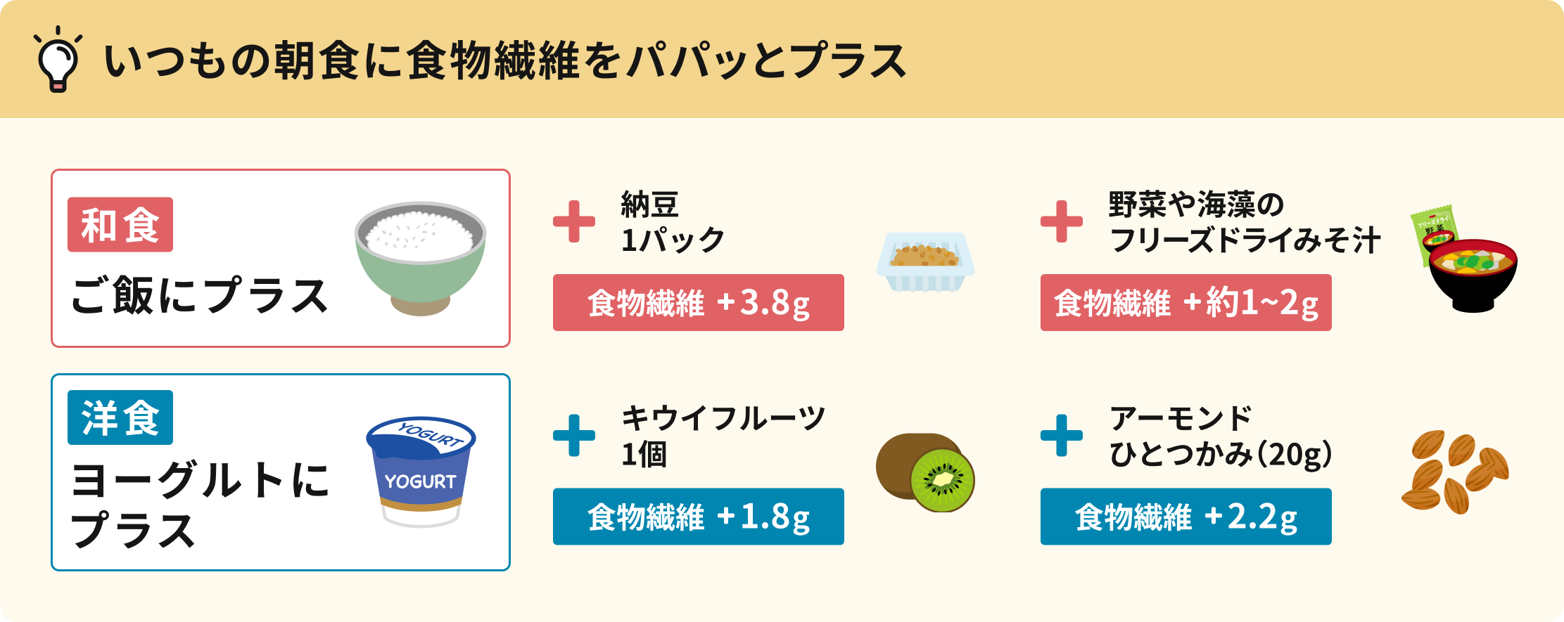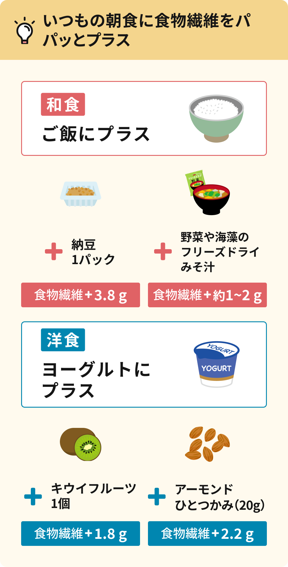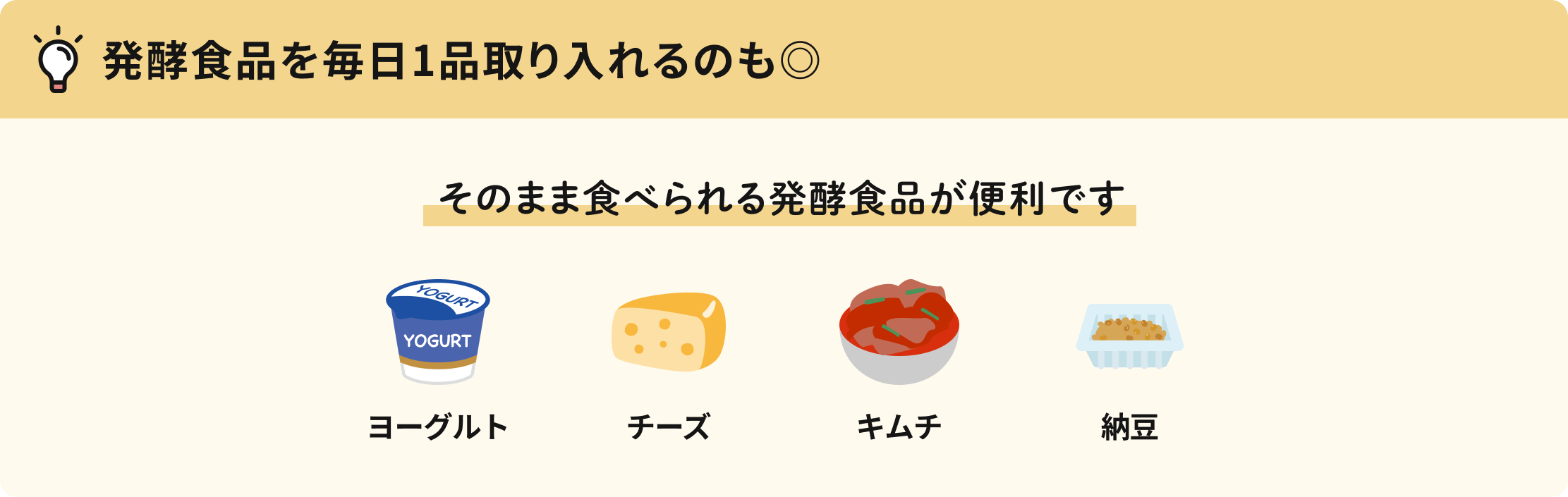 忙しくて作る時間がない方は、調理不要の食品などを取り入れて時短に。和食なら納豆、洋食ならヨーグルトやチーズが手軽な発酵食品としておすすめ。食物繊維をとれる野菜や海藻入りのフリーズドライみそ汁やくだもの、ナッツ類も時間のないときには便利です。