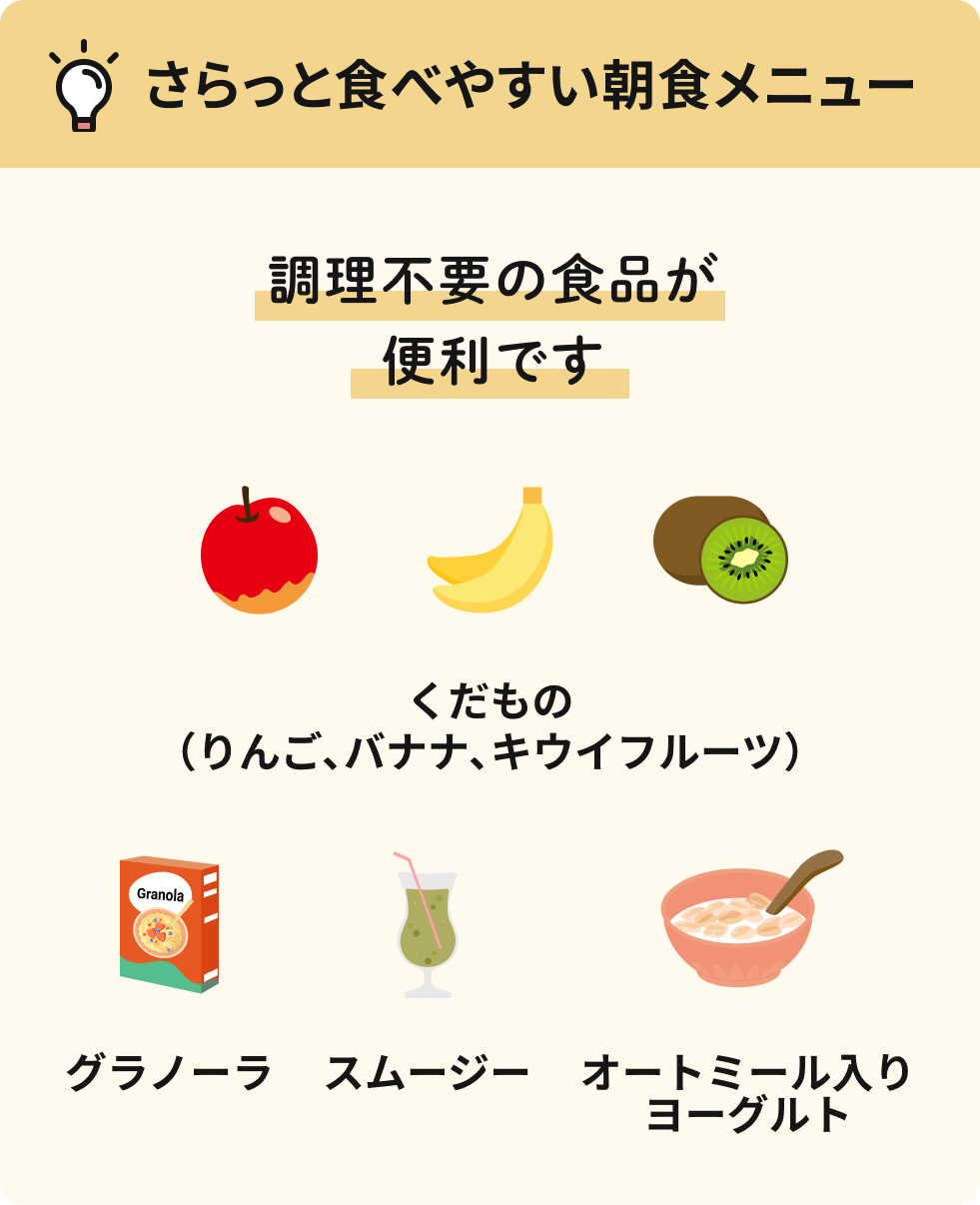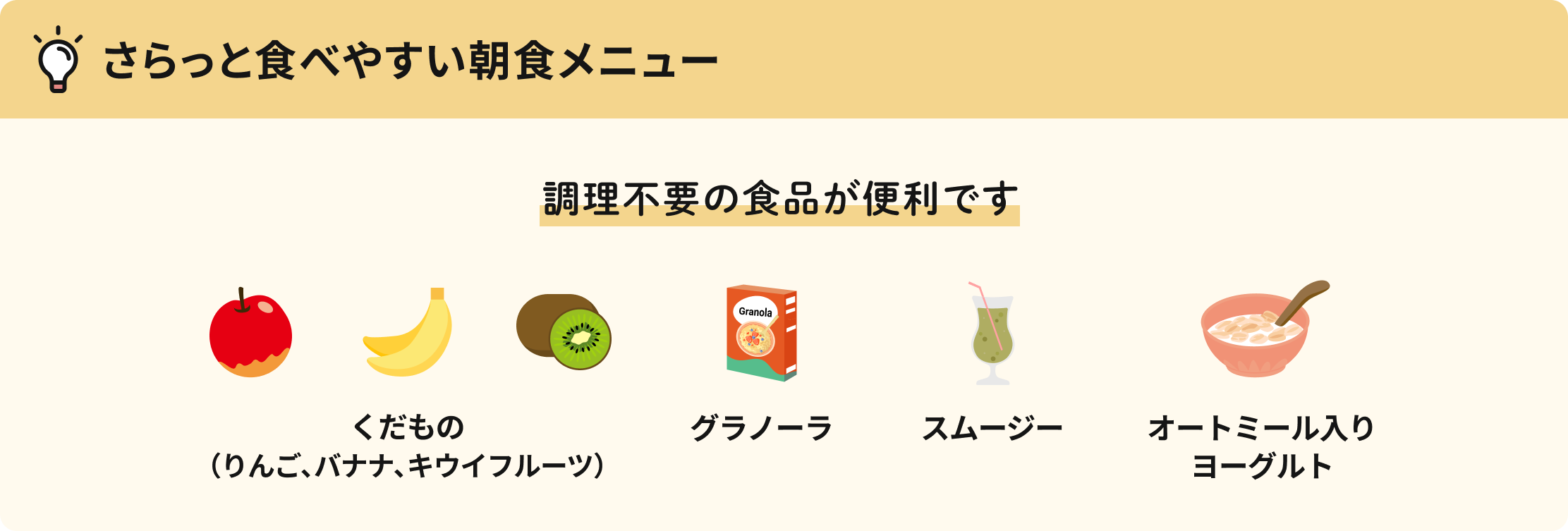 食欲がなくて朝食を抜きがちな方は、食べられそうなものを少量から試してみましょう。