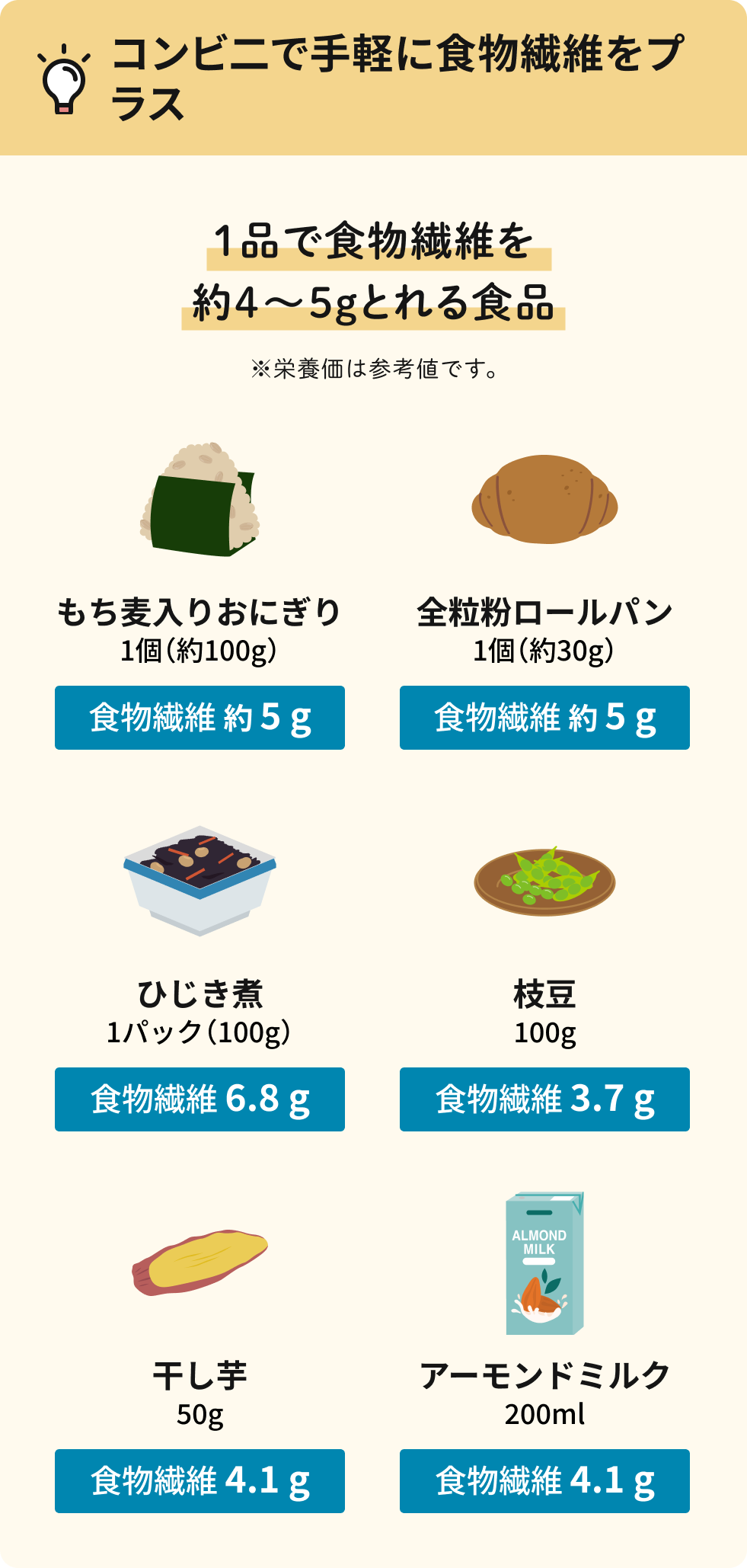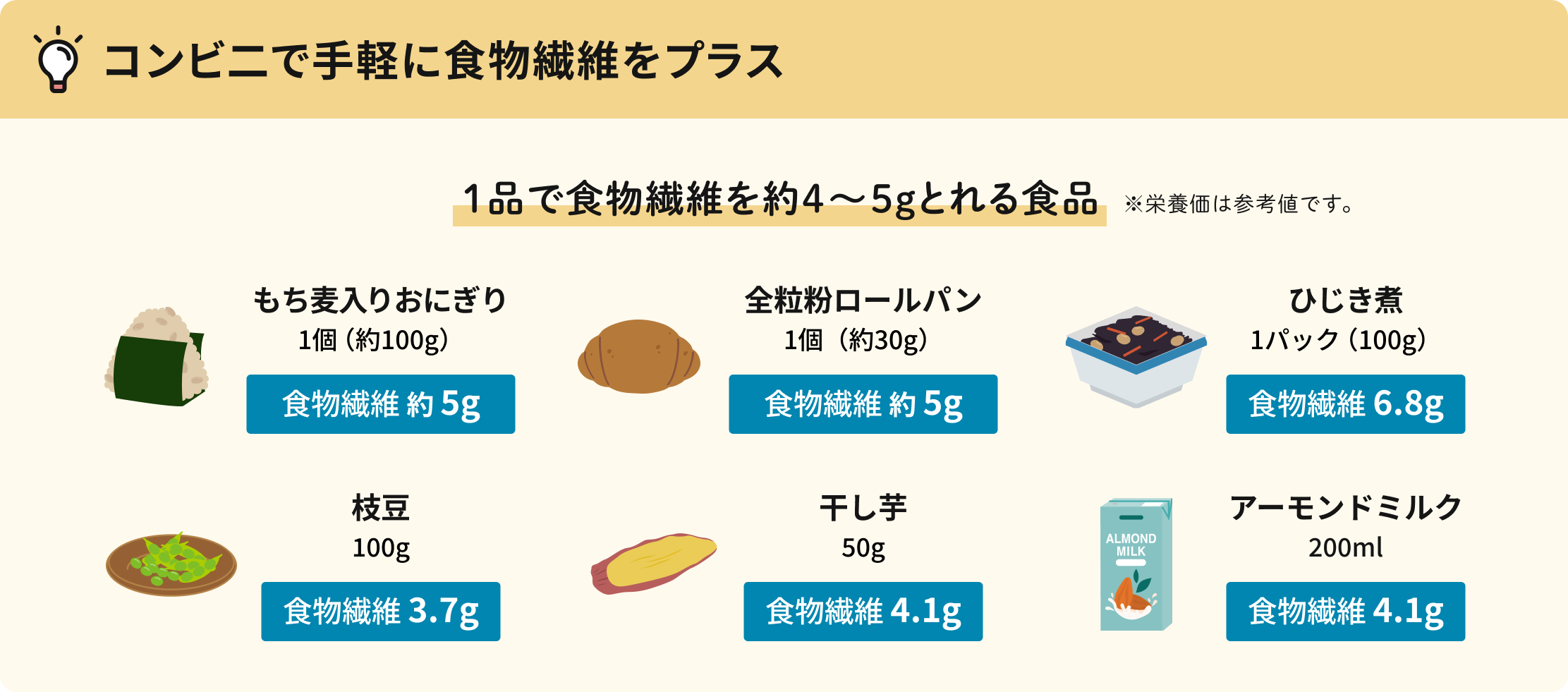 コンビニには、もち麦おにぎり、サラダ、惣菜、キムチ、チーズなど単品で食物繊維や発酵食品をとれる商品がいろいろ。1品プラスするだけで手軽に補えます。干しいもやカットフルーツ、飲み物などの間食で食物繊維をとるのも◎。