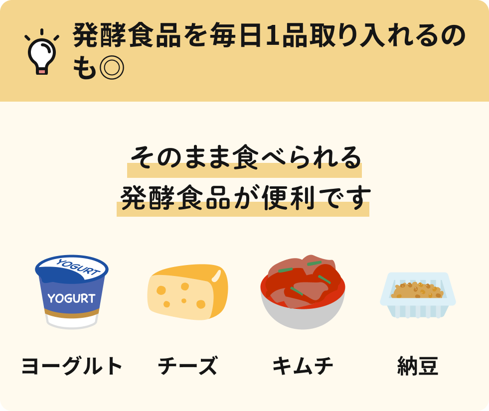 発酵食品に含まれる乳酸菌には腸内の善玉菌を増やし、腸内環境を整える働きがあります。腸内環境の改善は便秘の解消につながります。善玉菌のエサになるオリゴ糖も一緒にとるとGOOD。