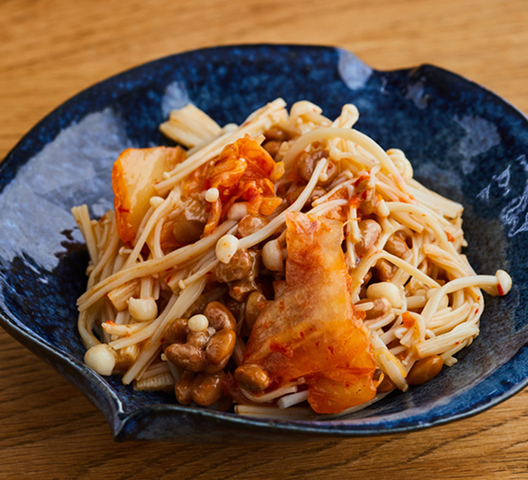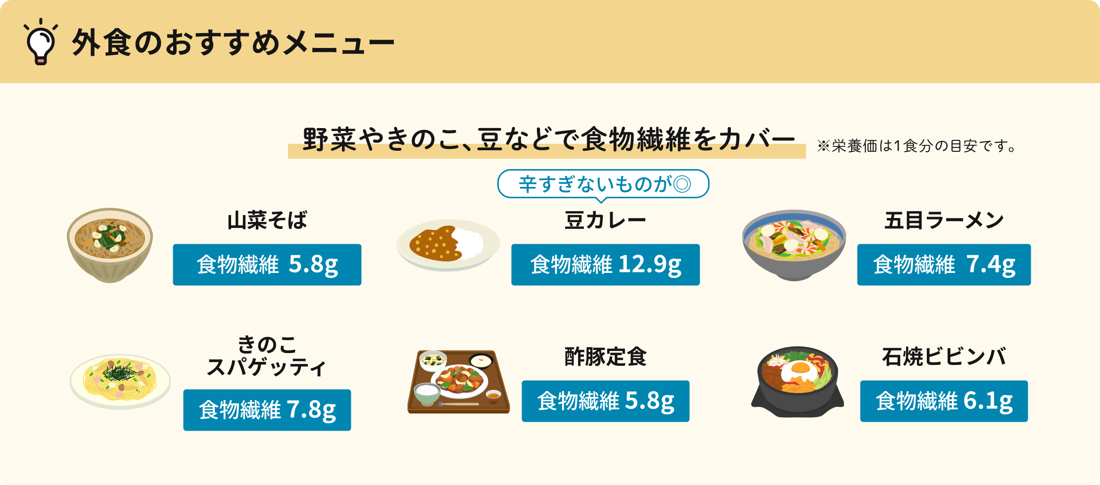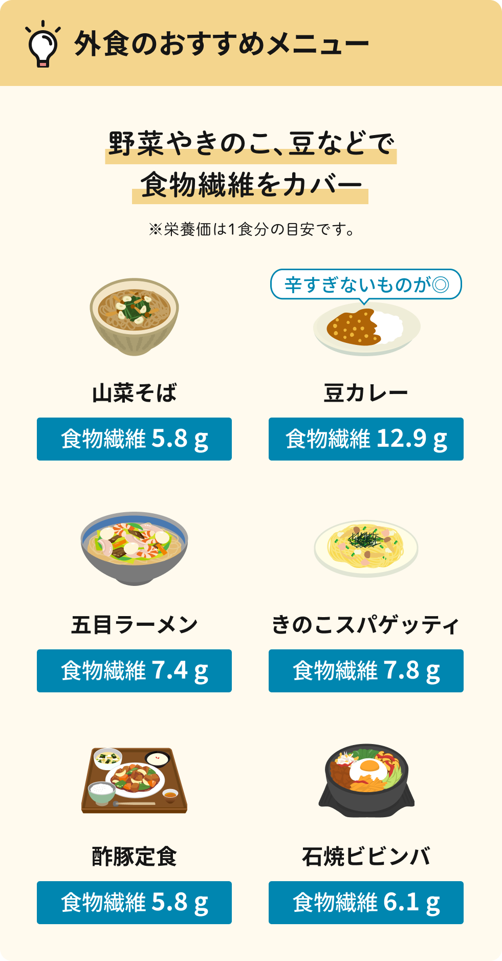 外食では野菜・根菜・きのこ・海藻入りのメニューを選ぶと食物繊維を自然にとれます。主食ならそばがおすすめですが、パスタやご飯にも食物繊維は含まれています。納豆やキムチ、チーズなどの発酵食品をトッピングやサイドメニューにつけるとさらにGOOD。