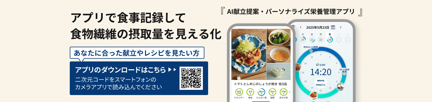 日本人の多くは食物繊維の摂取量が減少しており、食物繊維の量を強調した商品や外食メニューも増えてきています。栄養成分表示を見ながら、主食や主菜なら1品で食物繊維を5〜7g程度とれるものを選ぶのが理想的です。
