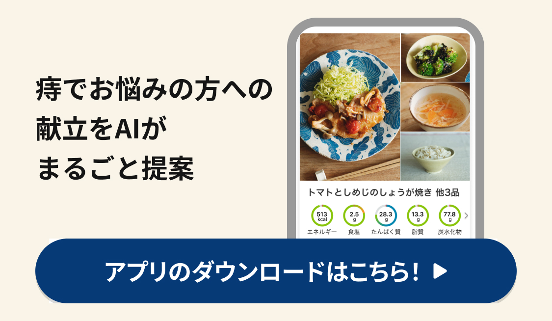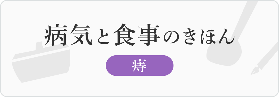 痔は、食事や食べ方で予防や改善することができます。積極的にとりたい食品はあっても、食べてはいけないものはないので、1日3食を楽しみながら、健康的なお通じのある生活を維持していけるといいですね。