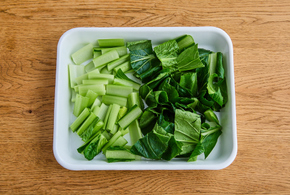 小松菜は4cm長さに切り、葉と茎を分けます。Aは混ぜ合わせておきます。