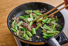 フライパンにごま油を中火で熱し、ひき肉と小松菜の茎を入れます。ひき肉の色が変わるまでしっかりと炒めます。