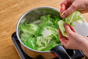 鍋に湯を沸かし、レタスを手でちぎりながら入れて2分ほどゆでます。