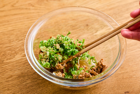 ボウルに汁けをきったさばみそ煮を入れてほぐします。