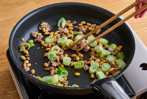 フライパンにごま油を中火で熱し、ひき肉を加えて炒めます。ポロポロになってきたら大豆、長ねぎを加えて2分ほど炒めます。