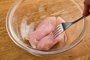 鶏肉は筋を取り除き、フォークで数箇所穴を開けます。