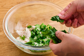 青じそを細かくちぎりながら加えます。ぽん酢しょうゆ、ごま油を加えて軽くあえたら出来上がりです。