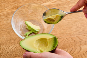 アボカドはスプーンで小さめの一口大にくりぬきます。卵は塩、粗びき黒こしょうと合わせて溶きほぐします。