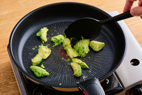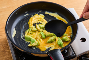 フッ素樹脂加工のフライパンにアボカドを入れて中火で2分ほど炒めます。アボカドの角がとろけてきたら溶き卵を加えて軽く混ぜます。