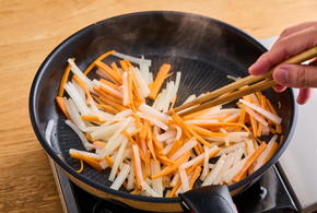 フライパンにごま油を中火で熱し、1の大根とにんじんを入れてしんなりとするまで4分ほど炒めます。