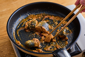 フッ素樹脂加工のフライパンにさばみそ煮を汁ごとを入れ、しょうがを加えて中火にします。