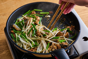 さばを食べやすい大きさに崩しながら、3分ほど炒めます。水けがなくなってきたらもやし、にら、鶏がらスープの素を加えます。