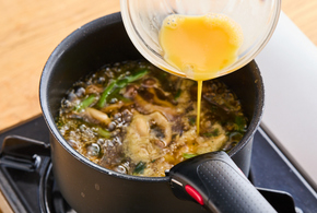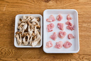 しめじは手でほぐします。鶏肉は小さめの一口大に切ります。卵は溶きほぐします。