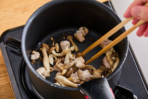 鍋にサラダ油を中火で熱し、鶏肉、しめじを入れてしめじがしんなりとするまで3分炒めます。