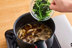 Aを加えて蓋をし、弱火で5分煮ます。煮ている間にそばは袋の表記通り加熱します。