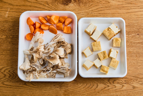 にんじんは一口大に切ります。まいたけは手でほぐします。厚揚げはペーパータオルで油を拭き取り、食べやすい大きさに切ります。