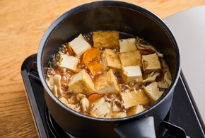 鍋に厚揚げ、にんじん、まいたけ、Aを入れて中火にし、煮汁が1/3量くらいになるまで10分ほど煮ます。
