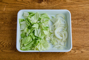 キャベツは食べやすい大きさに切ります。玉ねぎは薄切りにします。Aは混ぜ合わせます。