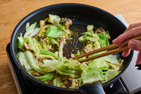 汁けがなくなりキャベツがしんなりとしたら、さばを一口大にほぐし、バター、Aを加えて全体を炒め合わせて出来上がりです。