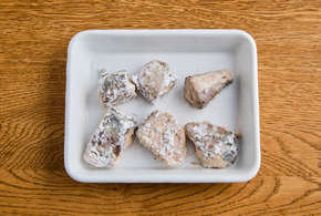 さば水煮は水けを拭き取り、片栗粉をまぶします。