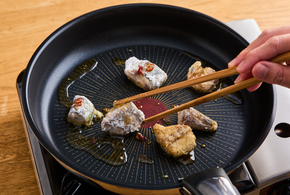 フライパンにごま油、赤とうがらしを弱火で熱し、香りが立ったらさばを並べて中火で両面を焼きます。