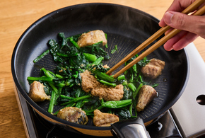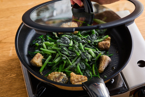 焼き色がついたら、凍ったままのほうれん草を加えます。蓋をして3分ほど蒸し焼きにします。