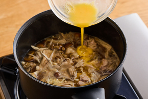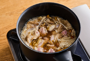 鍋にA、まいたけ、なめこ、えのきを入れて煮立てます。煮立ったら鶏肉を加えて弱火で5分ほど煮ます。