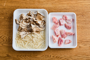 まいたけはほぐし、えのきは3等分に切ってほぐします。鶏肉は2cm角に切ります。