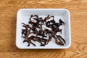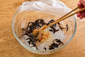 きくらげはぬるま湯に5〜10分ほど浸し、ふやけたら、細切りにします。
