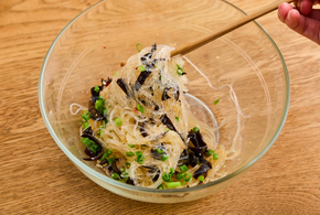 耐熱ボウルに春雨、きくらげ、水を入れ、ふんわりとラップをかけます。電子レンジ(600w)で3分加熱します。
