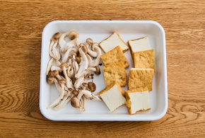 しめじは手でほぐし、厚揚げは厚さ1cmくらいの食べやすい大きさに切ります。