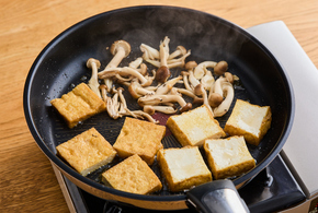 フライパンにごま油を中火で熱し、厚揚げ、しめじを並べます。厚揚げ全体に焼き色がつくまで4分ほど焼きます。