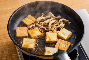 厚揚げの表面がカリッとなったら、弱火にし、20秒ほど待ちます。混ぜ合わせたAを加え、全体に絡めたら出来上がりです。