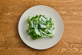 ピーマンは縦半分に切り、横1cm幅に切ります。ラップで包み、耐熱容器にのせて電子レンジ(600w)で30秒加熱します。