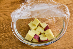 さつまいもは2cm角に切ります。耐熱容器に入れてふんわりとラップをし、電子レンジ(600w)で2分加熱します。
