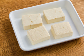 豆腐は半分に切り、さらに厚さを半分に切ります。ペーパータオルで水けをしっかりと拭き取ります。