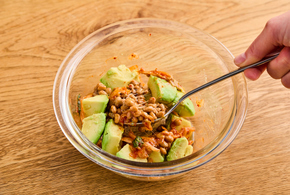 納豆をよく混ぜたら、その他の材料を加えます。全体に混ぜ合わせ、出来上がりです。