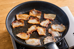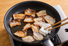 加熱時間は2人分の目安です。豚バラ肉から脂が出るため、油のはねにご注意ください。