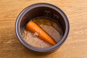 にんじんを丸ごと真ん中にのせ、ツナは油ごと加えます。通常モードで炊飯します。