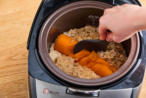 炊き上がったら、にんじんをしゃもじで崩すように混ぜ、全体が均一になるようにさっくりと混ぜ合わせて出来上がりです。