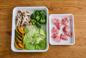 キャベツはざく切りに、かぼちゃは1cm厚さの食べやすい大きさ、ブロッコリーは小房に分け、しめじはほぐします。