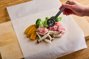 クッキングシートを広げ、真ん中にキャベツ、その上に、鶏肉、かぼちゃ、ブロッコリー、しめじをのせ、酒を回しかけます。