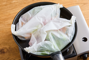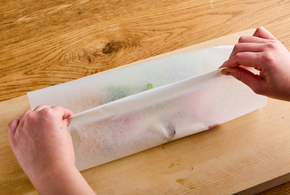 シートを手前側から具材を全て覆うようにかぶせ、奥側からも覆いかぶせます。重なる部分を2回ほど折り、両端をねじります。