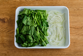 ほうれん草は4cm幅に、玉ねぎは薄切りにします。