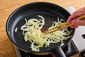 フライパンにオリーブ油を中火で熱し、玉ねぎを加えてしんなりとするまで2分ほど炒めます。